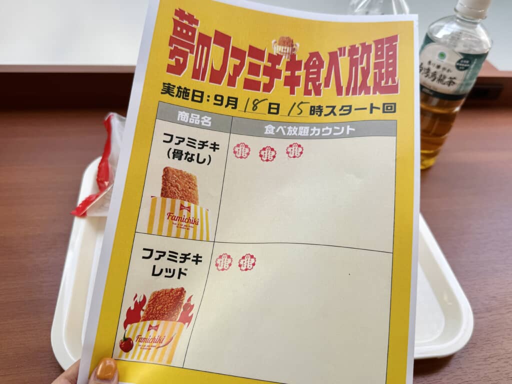 先行体験では、10個以上食べた人もいれば、3個から4個ほどで満足したという人も。またバンズや他の食べ物は一切食べずにファミチキと飲み物だけのスタイルを貫いた人もいれば、店内で買えるアイスなどを挟みながら楽しんだ人もいて、30分の食べ放題にもさまざまな楽しみ方があるようでした。
