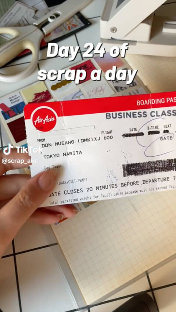 この日akrさんは、「AirAsia(エアアジア)」の航空券を用意。アマゾンで購入したというクラフトパンチでロゴ部分を四角く切り抜き、裏にテープのりをつけてスクラップブックに貼り付けました。