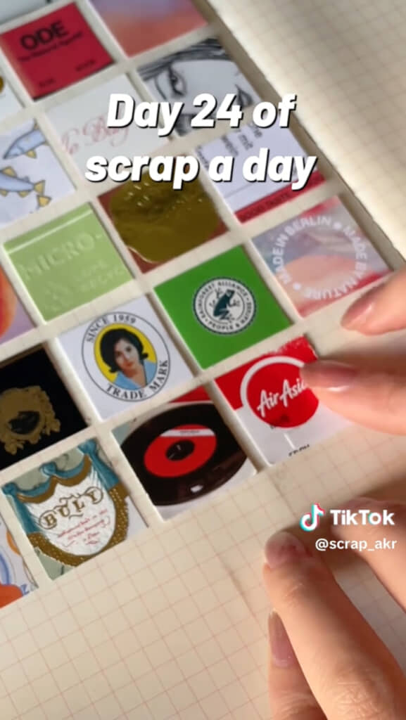 投稿したのは、不要になったパッケージやチケットなどでスクラップブックを制作しているakr(@scrap_akr)さん。スクラップブックとは、写真やチケット、パンフレットなどの切り抜きをノートやアルバムに貼りまとめたもの。今回注目を集めたのは、スクラップブックを作り始めて24日目の様子です。