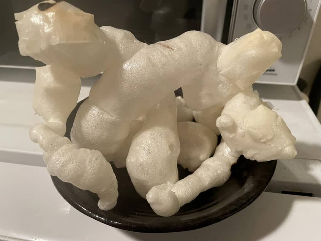 切り餅の変わり果てた姿に対し、リプライ欄などでは「かっけぇ……」「白いイワーク」「モチモチ様ぁ」「ミャクミャク様のお友達かな」「新生物ですね…」「でっかい生姜みたい!」「しょうがみたいな造形」など、さまざまなものを連想するコメントが多数寄せられていました。確かに大きな生姜みたいな雰囲気も感じます……!