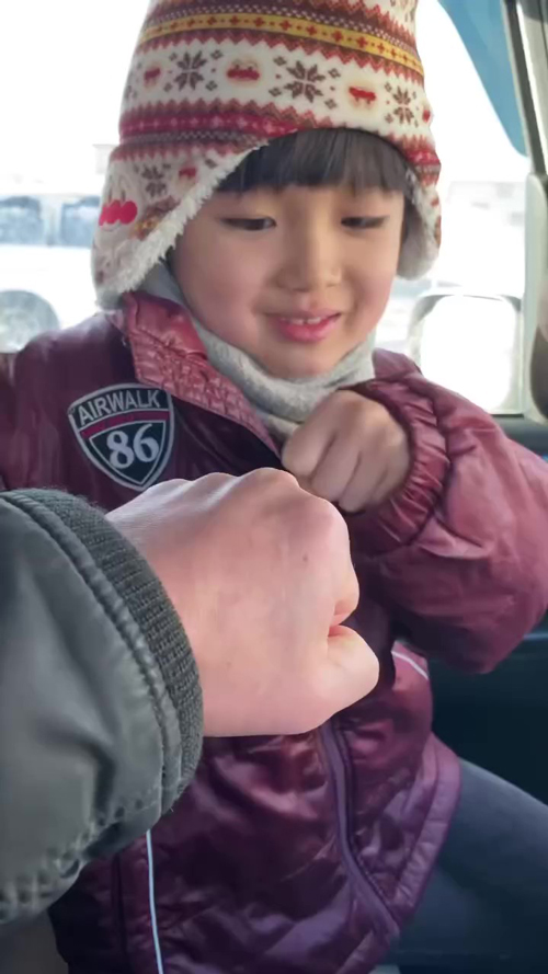やがて薄手の服装になり、少しずつ暖かくなってきたようです。いつものようにグータッチをしていますが、ようたくんは帽子をかぶらなくなり、その表情などがよく見えるように。最初のころと比べて反応が良くなり、笑顔が増えたような……?