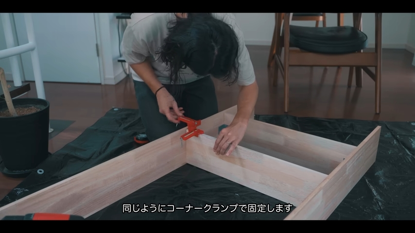 用意したのは「ファルカタ集成材」という木板で、柔らかくて扱いやすい木材だといいます。組み立てるために木板に線を引いていき、固定金具を取り付ける下準備を進めます。