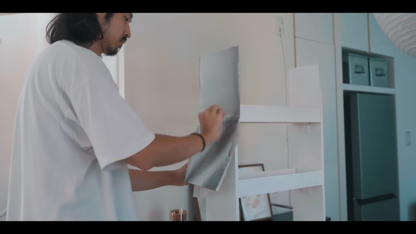 しっかり乾燥したら、棚の表面に冷蔵庫に使ったマスキングテープとダイノックシートを貼り付けます。ヤスリをていねいにかけていたおかげで、表面がボコボコとすることなく、とてもきれいに仕上がりました。