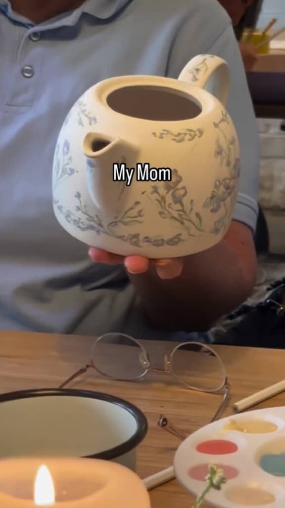 一方で、サリーさんの母親もティーポットに絵付けしていたようで、動画の後半には薄い紫の花が描かれているまるで職人が絵付けしたようなクオリティーの高いティーポットが映っています。控えめな紫色が上品さを醸し出していて、これで紅茶をいれて飲むと穏やかな時間が過ごせそうです。