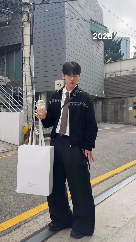 しかし2025年になると、投稿者さんは自身の好きなスタイルが明確になった様子。オーバーサイズのパンツやジャケット、緩やかに垂らしたネクタイを合わせたコーディネートなど、街角で撮影された姿からは、堂々とした余裕を感じさせます。