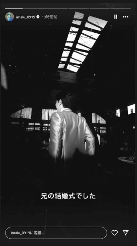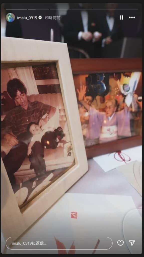 なお、二千翔さんの手を引く役目だったというIMALUさんが、タキシード姿で式場に立つ兄の姿、先述の写真を飾ったテーブルの写真などをInstagramのストーリーズに掲載してお祝いしたほか、新婦の書の先生を務めている日展作家・上籠鈍牛さんも式に参加した大竹さんとさんまさんのにこやかな笑顔の写真を同じく投稿していました。