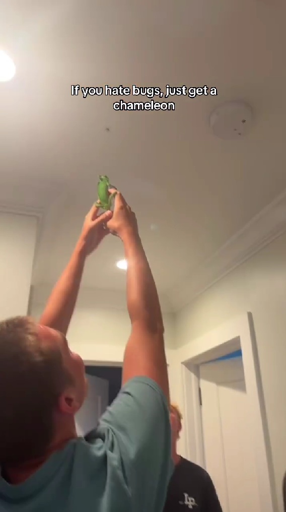 飼い主さんがカメレオンをゆっくりと天井に近付けます。標的となるクモとの距離が縮まると、カメレオンが一瞬で舌を伸ばし、見事に捕獲。ほんの数秒の出来事ながら、その正確さとスピードに驚かされますね。動画には「虫が嫌いならカメレオンを飼えばいいじゃない」とテロップが出ています。