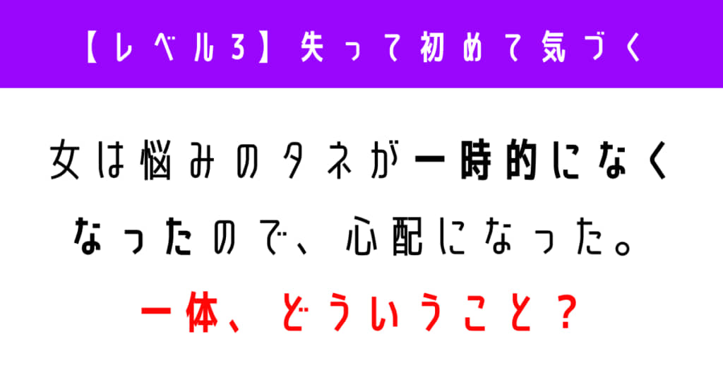 女は悩みのタネが一時的になくなったので、心配になった。一体、どういうこと? 「ウミガメのスープ」クイズに挑戦!【レベル3】