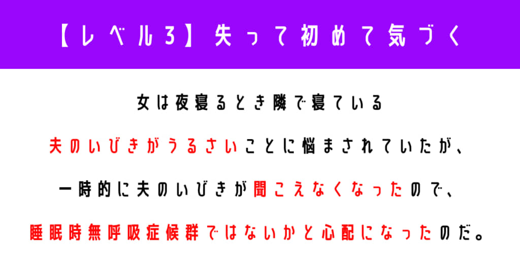 【解答】女は夜寝るとき隣で寝ている夫のいびきがうるさいことに悩まされていたが、一時的に夫のいびきが聞こえなくなったので、睡眠時無呼吸症候群ではないかと心配になったのだ。