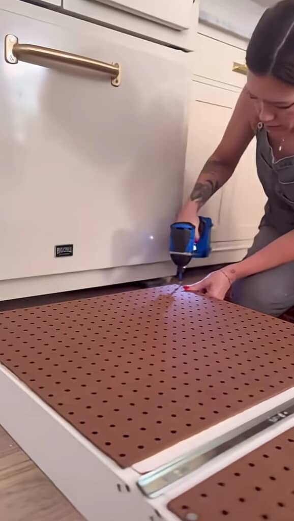 次に穴の開いたペグボードを先ほどの基盤のサイズに合わせてカットして固定。白く塗装を施すことで、見た目にも清潔感のある仕上がりになりました。乾燥させている間に冷蔵庫を動かし、壁側にも引き出しレールを設置するなど準備を進めます。