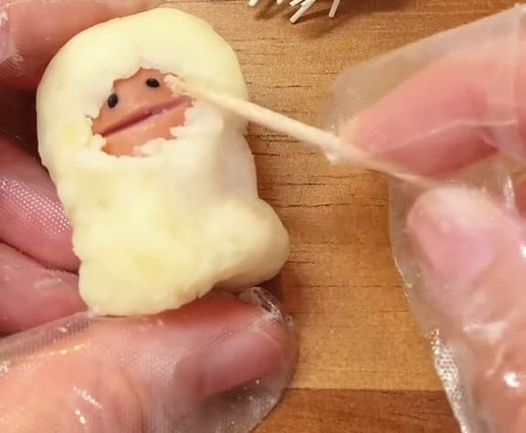 次はマッシュポテトでくるんで成形し、ソーセー人をモコモコの着ぐるみ風に。さらに、コーンフレークで耳を作り、短く折ったそうめんをびっしり刺していくと、ある動物に見えてきます。