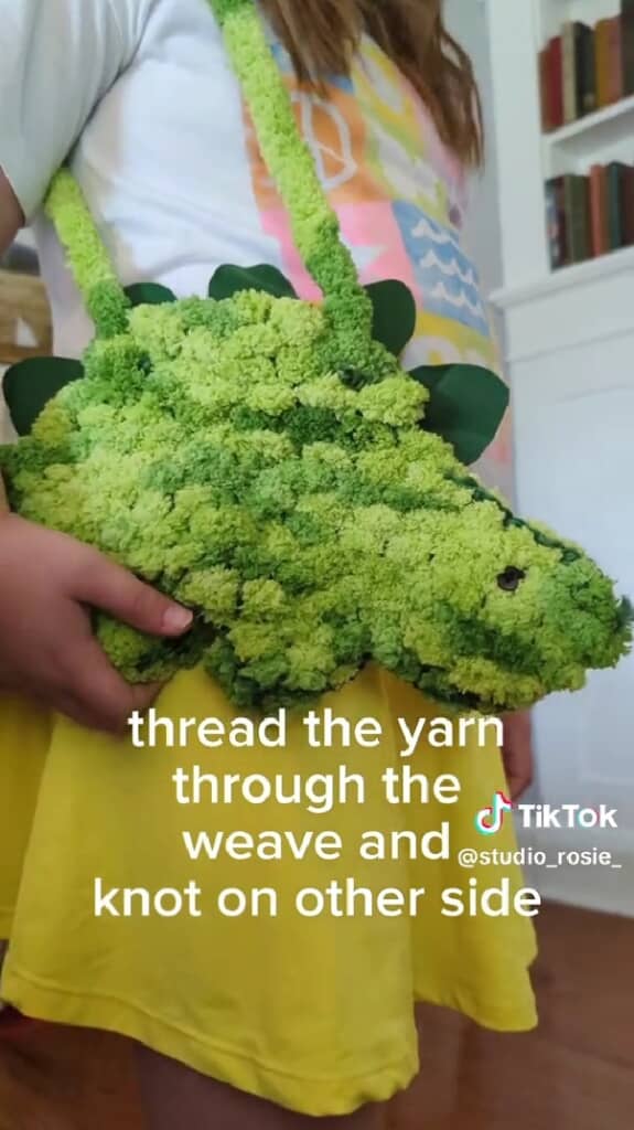 同じものを2枚作り、外表にして縫い合わせると、立体的なバッグの形になりました。最後に毛糸で作ったストラップを取り付けると……世界にひとつだけの恐竜バッグの完成です!