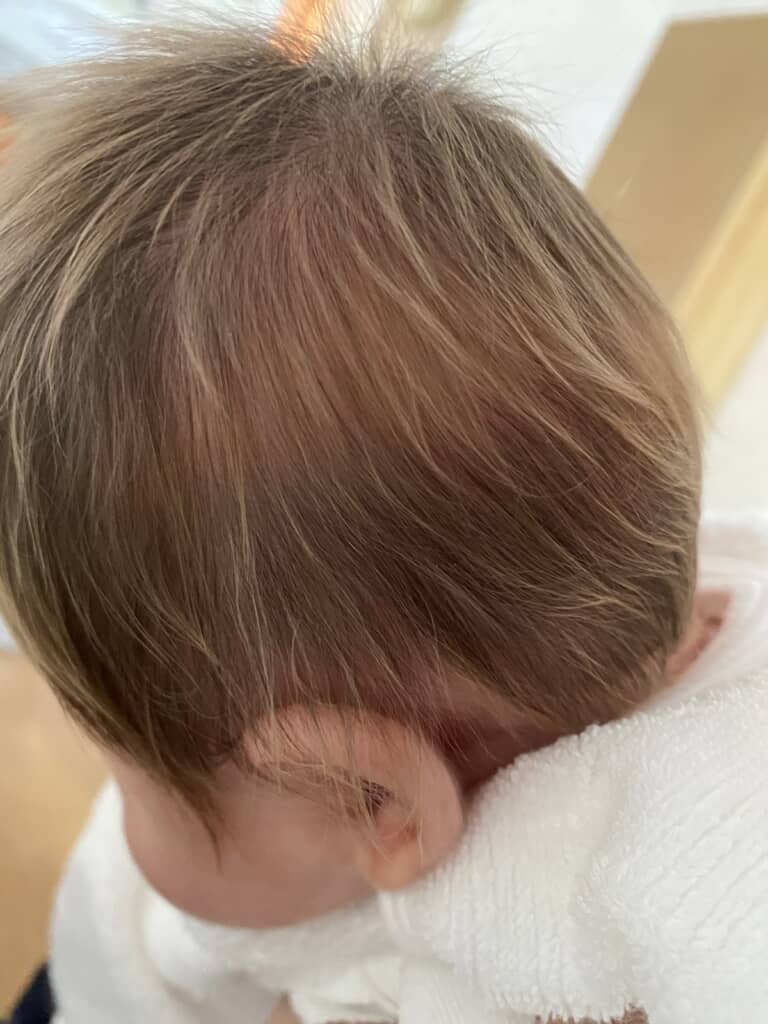 ところどころ暗い金髪にも見えるほど明るい色ですが、このような色になる主な理由は、赤ちゃんのメラニン色素の生成がまだ不安定なため、一時的に髪の毛の色が薄くなっていることなのだそうです。
