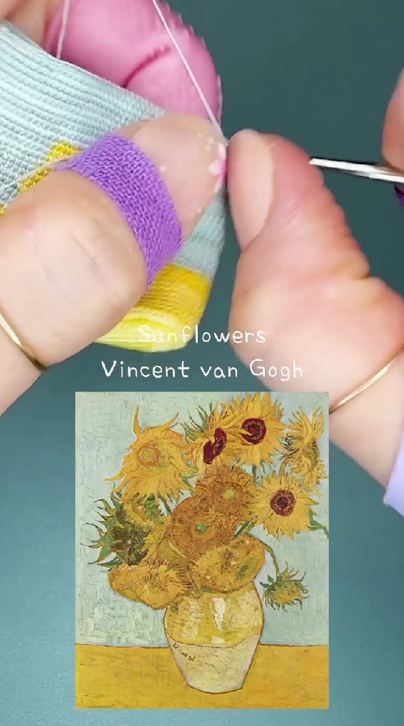 今回紹介するのは、ゴッホの『ひまわり』を手のひらサイズの編み物で見事に再現した動画です。世界中の美術ファンに愛されるフィンセント・ファン・ゴッホ。その代表作のひとつ『ひまわり』は、黄色を基調とした鮮やかな色彩と生命力あふれる花々の表現で、時代を超えて人々を魅了してきました。そんな名画を、なんと針と糸で手のひらに収まるほどの小さなバッグとして再現していきます。