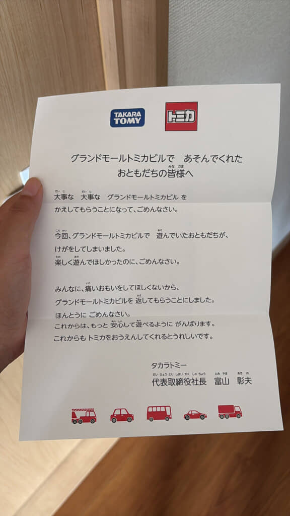 届いた手紙には「あそんでくれたおともだちの皆様へ」「遊んでいたおともだちが、けがをしてしまいました」と、子ども向けにやわらかい表現で誠実な文章が書かれていました。理由を説明しながら謝罪の意が込められた文面の最後には代表取締役社長の署名が添えられています。