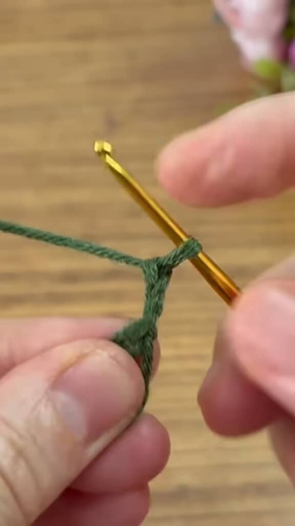 まずは鎖編みで土台を作る工程からスタート。緑色の毛糸で輪を作り、かぎ針で糸をすくい上げながら編み目を重ねていくのが基本の流れです。これが花の軸の部分になります。