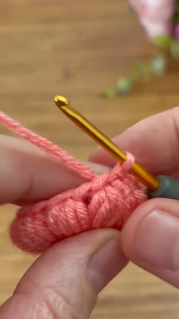 小さな円形に編んで土台ができたら、ピンクの毛糸に切り替えて花びら部分をボリュームたっぷりに編んでいきます。