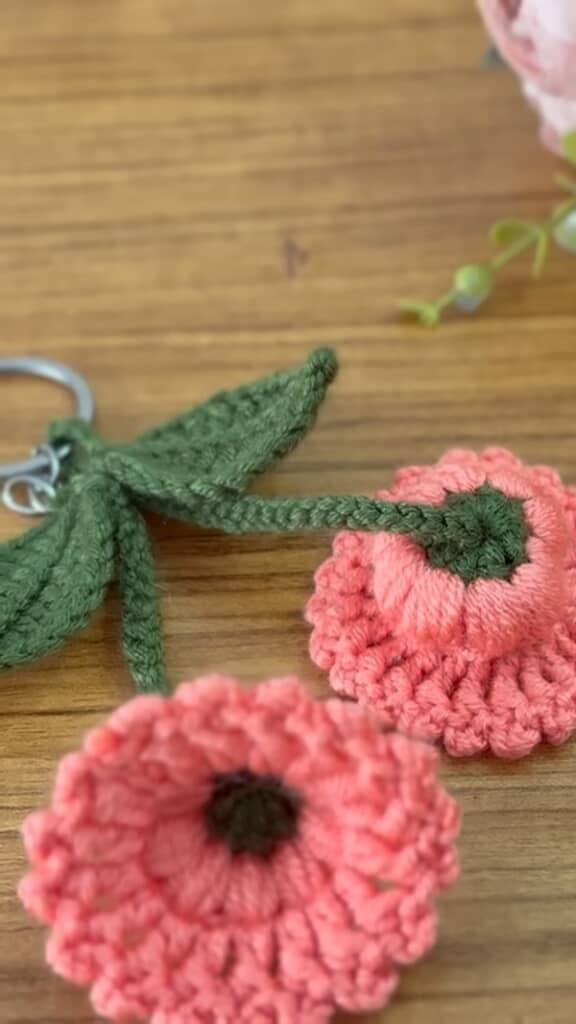 2枚の葉をつけるとバランスがよく、作品全体の完成度が一気にアップします。茎部分は細長く編んで花とつなげました。最後にキーホルダー金具をつけると……持ち歩きできる小さな毛糸のお花が完成です!