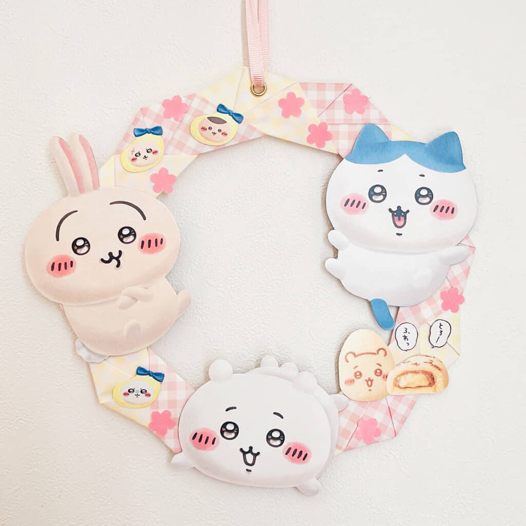 その作品は、ピンクのチェック柄を基調とした華やかな見た目で、「なんか小さくてかわいいやつ(通称・ちいかわ)」に登場するキャラクター3体が貼られています。桜のマークや商品画像なども散りばめられ、思わず手に取りたくなるようなかわいさ。