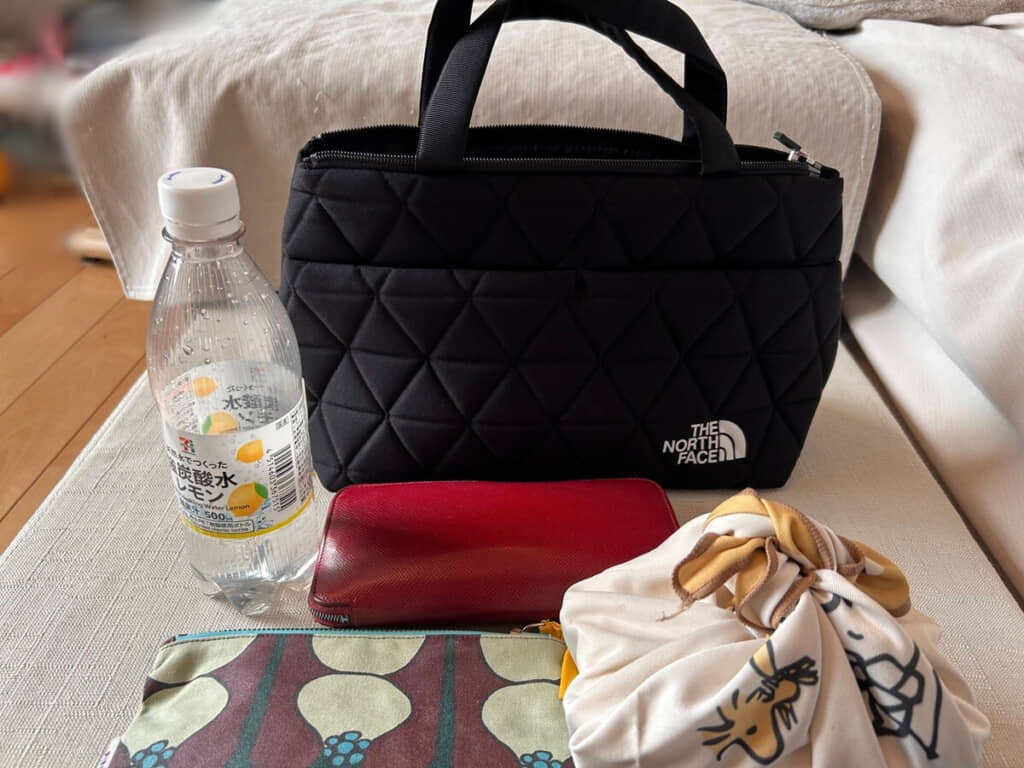 ペットボトル、ポーチ、二つ折り財布、お弁当を入れてこんな感じ