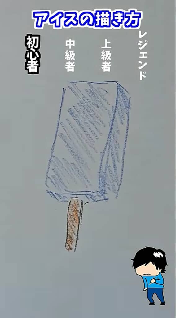 1/4)まずは初心者編。青い長方形のアイスキャンディーがザクッと色鉛筆で描かれています。素朴でかわいらしい1枚