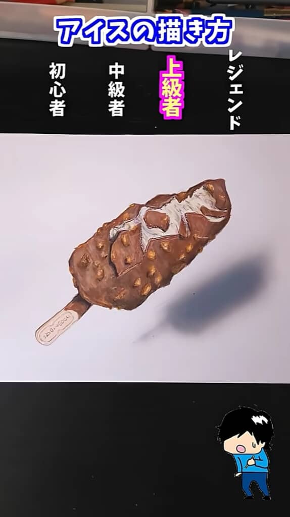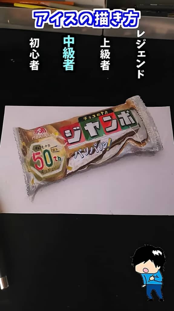 2/4)続く中級者編では、描かれているのはあの「チョコモナカジャンボ」! パッケージのハイライトやロゴまでも精密に再現され、まるで本物を置いたかのようなリアルさ