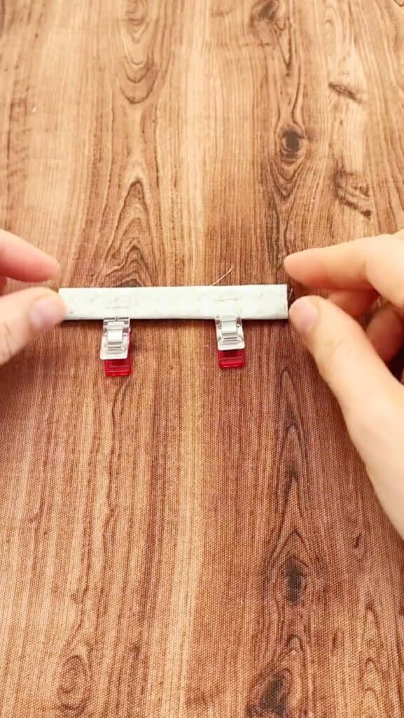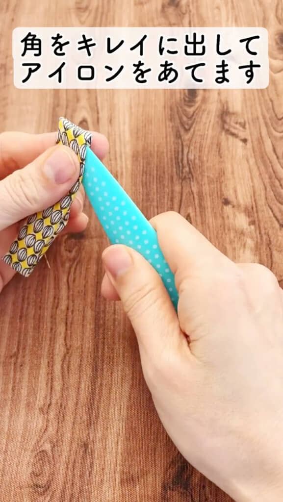 まずはハギレを2回半分に折り、細長い状態にしてクリップで固定します。ミシンで両端を縫い代5ミリで縫ったら、表に返して角をキレイに出し、アイロンをあてていきます。なお、動画内では「角出し」という道具を使用していますが、ない場合は目打ちなど先のとがったもので出すといいでしょう。