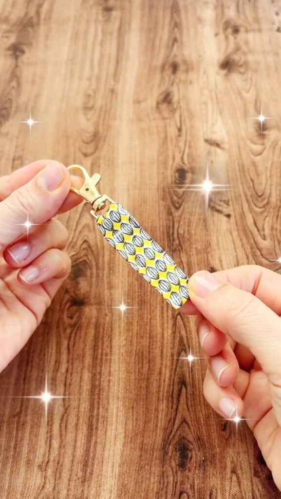 続いてナスカンの穴に生地を入れ、1.5センチあたりで折り返します。最後に折り重なった真ん中部分にミシンの針を落として端をぐるっと一周縫えば……あっという間にハギレのキーホルダーが完成しました!