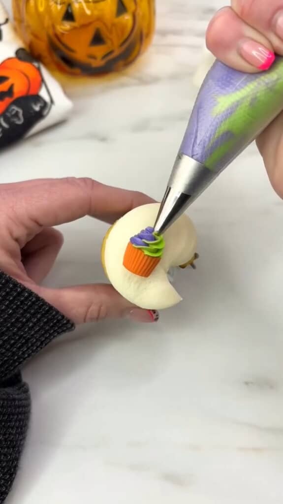 続いて、白いクリームを、カップケーキの形に添って絞ります。さらに、その上にオレンジ色のカップケーキ型のような飾りを置き、上に紫色と緑色のクリームを乗せることで、小さなカップケーキの上に、さらに小さな「ミニカップケーキ」が置かれたようになりました。