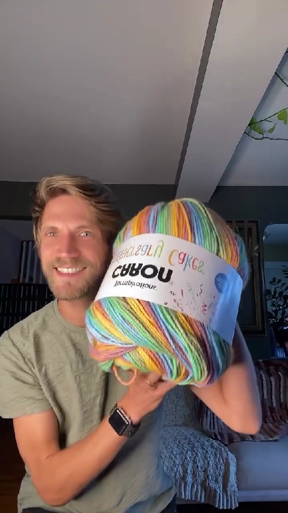 今回紹介するのは、巨大な毛糸玉からカラフルなロングジャケットを編み上げる動画です。動画冒頭に出てくる投稿者さんが抱えているのは、普通の毛糸玉の10倍以上はあろうかというほどの特大サイズの毛糸玉。虹のように鮮やかなピンク、イエロー、グリーン、ブルーが混ざり合っています。投稿者さんの表情からはワクワク感があふれていますね。