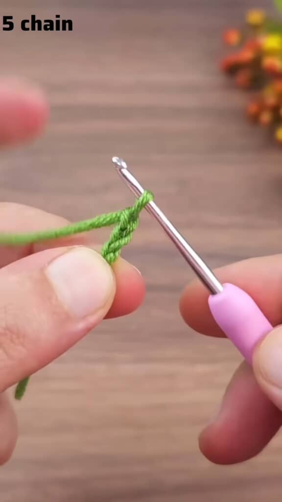 まずは、緑色の毛糸から編み始めます。鎖編みを5目したら、戻って長編みと鎖編みを交互に編み入れると小さな円の形になりました。この後は毛糸の色を変えて編みます。