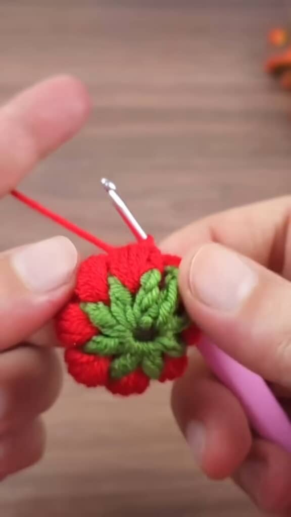 次に登場したのは、鮮やかな赤い毛糸。先ほど編んだ緑の円にあるスペースへ赤の毛糸を通し、1つの穴に5回ずつ細編みの途中になるようにかぎ針に糸を残してループを作りました。5回分のループをまとめて1回こま編みをすると、厚みのあるぷっくりとした花びらのようになります。リズミカルに手を動かし、かわいらしい花がどんどんできていく様子は見ているだけでも楽しいですね。