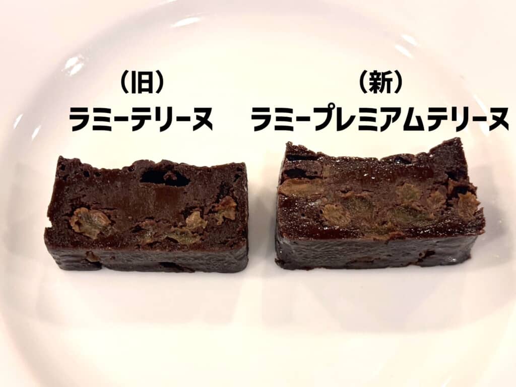 「ラミー」のラムレーズンを使用したショコラテリーヌは、2021年2月に「ラミーテリーヌ」として初登場しました。そこから特製ラムレーズンの量を約2倍に増量し、よりずっしりと食べごたえのある味わいに進化したのが、今回発売される「ラミープレミアムテリーヌ」。ちなみに、価格は据え置きのままラムレーズンを増量&全体重量もUPしたそうです。