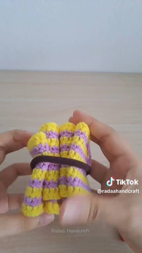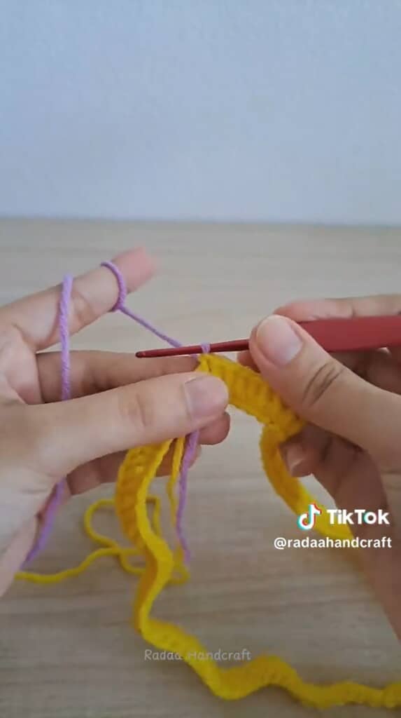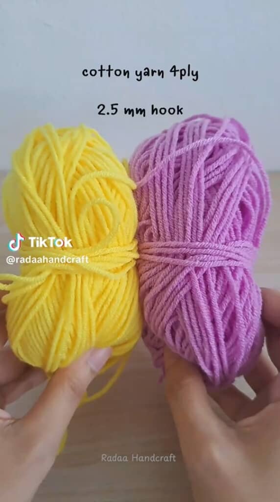 投稿者はTikTokユーザーの「Radaa.handcraft」(@radaahandcraft)さん。かぎ編みで制作したかわいいモチーフや小物を投稿しています。今回用意したのは紫と黄色、2色の毛糸。2.5ミリのかぎ針を使って、あるものを作っていきます。
