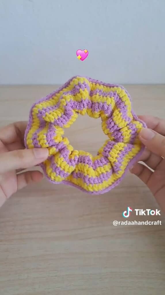 こうして完成したのは、紫色と黄色の組み合わせがキュートな“シュシュ”。毛糸で編まれたシュシュなんて、とてもおしゃれですね。シンプルにまとめただけの髪でも、良いアクセントになってくれそうです。