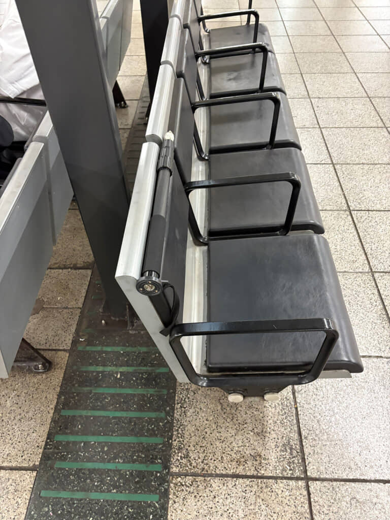 背もたれのクッション部分で一脚を発見! デザインが黒とグレーでシンプルなのもあって、同じ色のベンチと“同化”してしまっていたのです。なくした本人以外は誰も気が付かないほど一体化している様子は、まるで間違い探しのようだ……。