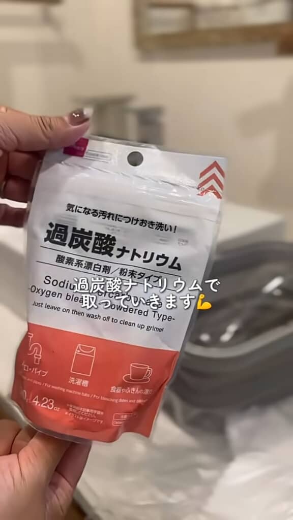 そんな頑固な汚れに使用するのは、ダイソーで購入した過炭酸ナトリウム。酸素系漂白剤として販売されていて掃除はもちろん、衣類やキッチン用品の漂白・消臭などにも使用できます。
