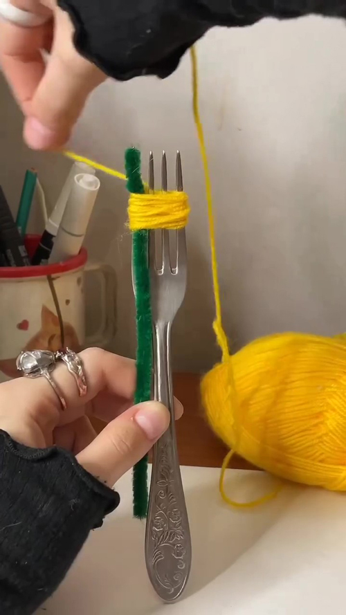 緑のモールをフォークに添えて、黄色の毛糸を巻き付けていくと…… 予想外の完成品に「なんという創造性」「試してみる」【海外】