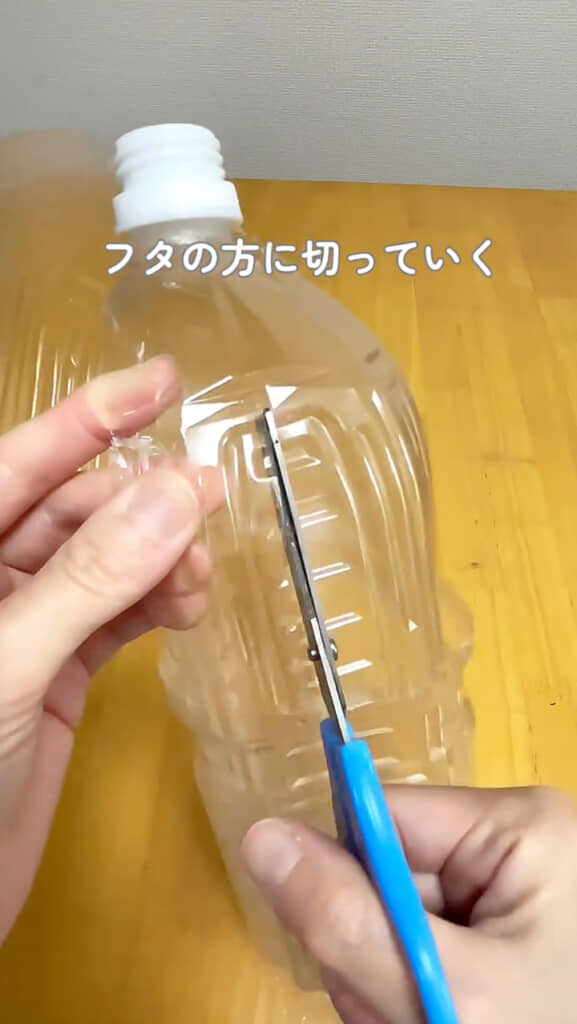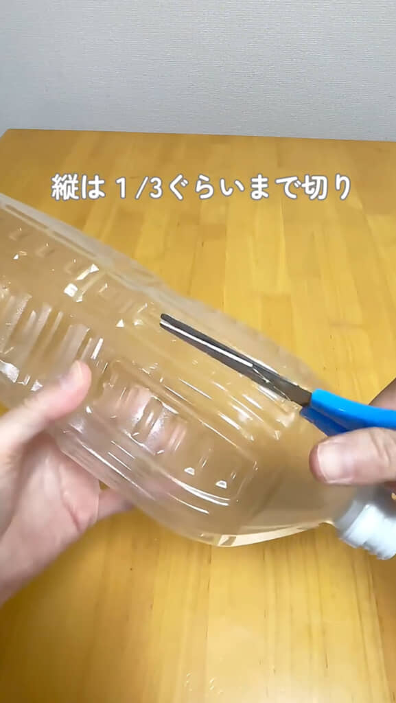 用意するのは、ペットボトルとハサミだけ。まずは、ペットボトルの飲み口の下を1/4ほど残してぐるっとカット。そのまま縦方向に1/3程度切り込みを入れ、飲み口の下と同じように横方向をカットします。