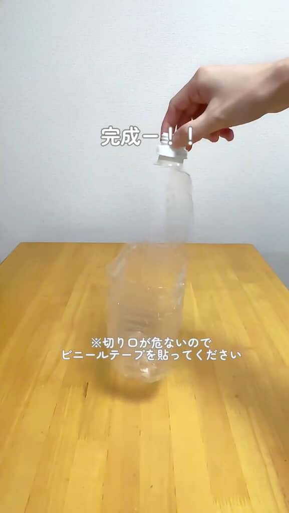 そして最後に、飲み口に向かってハサミを入れたら……あっという間にゴミ箱が完成です! なお、ケガをしないよう切り口にビニールテープを貼り、必ず保護しておきましょう。