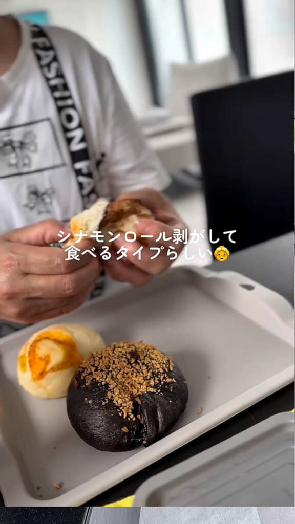 それぞれパンを取り終わったら、早速ランチスタート。これだけ種類豊富だと何を選べば良いのか迷ってしまいそうですよね。ちなみにばあばがチョイスしたのは、「シナモンレーズンパン」「ココアキャラメルベーグル」「ハムチーズ」の3種類。娘の手作りパンに魅了されたようで、翌日の朝食用のパンもお土産にお持ち帰りしたそうですよ。