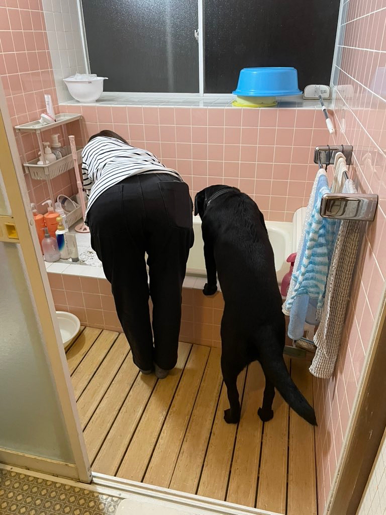 お風呂の湯加減をチェックする飼い主さんの隣で、同じように浴槽をのぞき込む小梅ちゃん。並んだ姿がまるで親子のよう