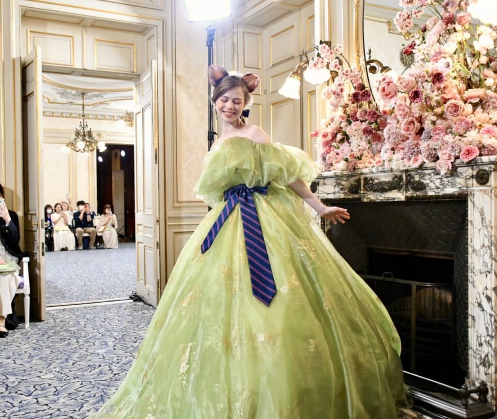 元詐欺師のキツネ「ニック・ワイルド」をモチーフにしたウエディングドレスは、ニックが劇中で身に着けていたシャツを思い起こすライトグリーンのカラー。ふわふわでボリュームたっぷりなケープは取り外しができるそうです。