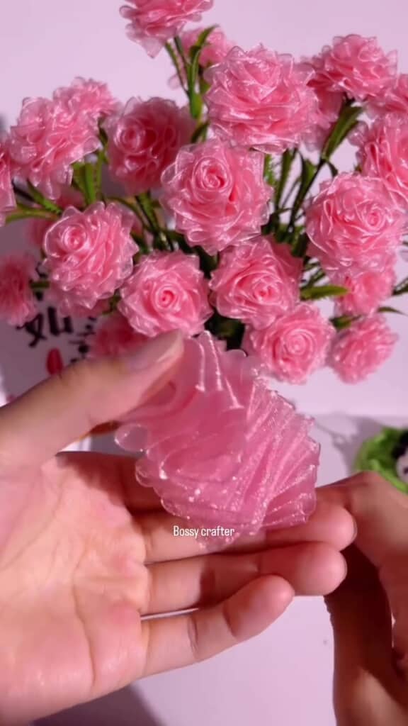 動画を投稿したのは「Bossy Crafter」。リボンやモールを使った造花作りを紹介しているアカウントです。今回の作品にはピンクのリボンを使用。まずは蛇腹状に折り畳みつつ、中心に針を刺していきます。
