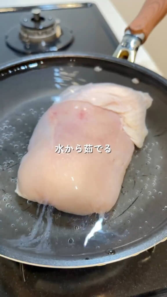 1品目は、鶏むね肉を茹でるところからスタート。沸騰させずに水の状態から茹でるので、手間がかからず簡単! 火が通ったら取り出し、冷めてから手でほぐします。