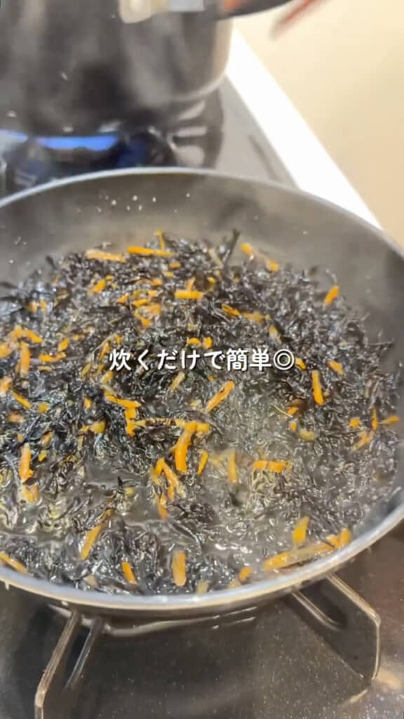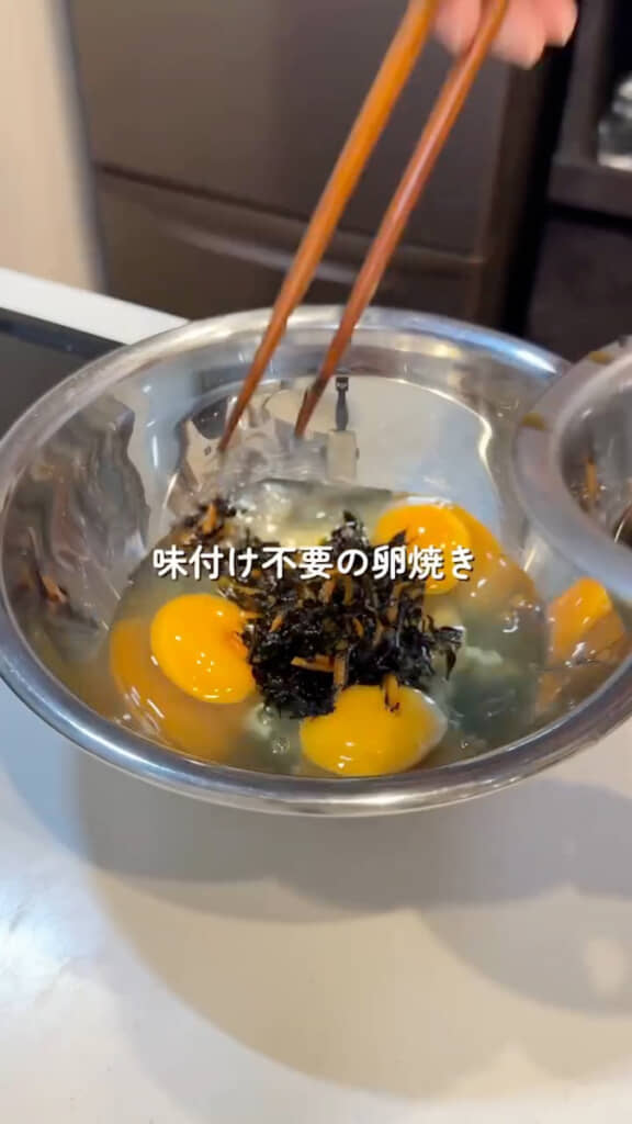 2品目には、ひじきを使った別のレシピも展開。1品目で炊いたひじきの煮物と生卵を混ぜ合わせて焼くだけの、味付け不要の簡単卵焼き! ひじきの煮物に味が付いているので、新たに調味料を足さなくても、しっかり味が染みた卵焼きになるそうです。