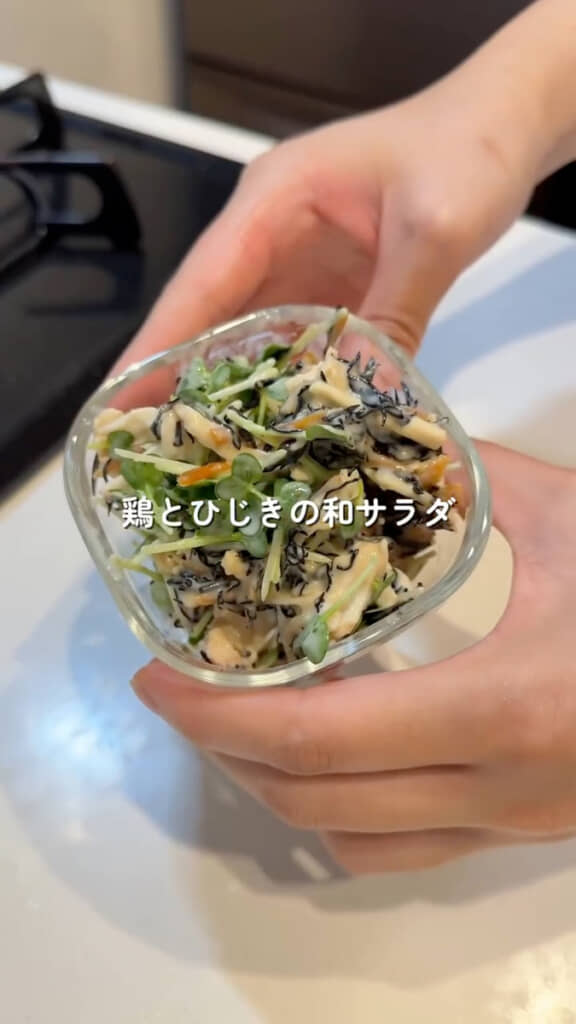次は、水・砂糖・しょうゆ・みりん・白だしと一緒に、乾燥ひじきと人参を小鍋に入れて、煮汁が少なくなるまで炊くだけ。この状態ですでにひじきの煮物の完成ですが、今回は鶏肉を足して少しアレンジ。先ほどほぐした鶏肉と豆苗を入れ、マヨネーズで和えたら、「鶏とひじきの和サラダ」の出来上がり! 栄養バランス満点で、彩りも美しい1品です。