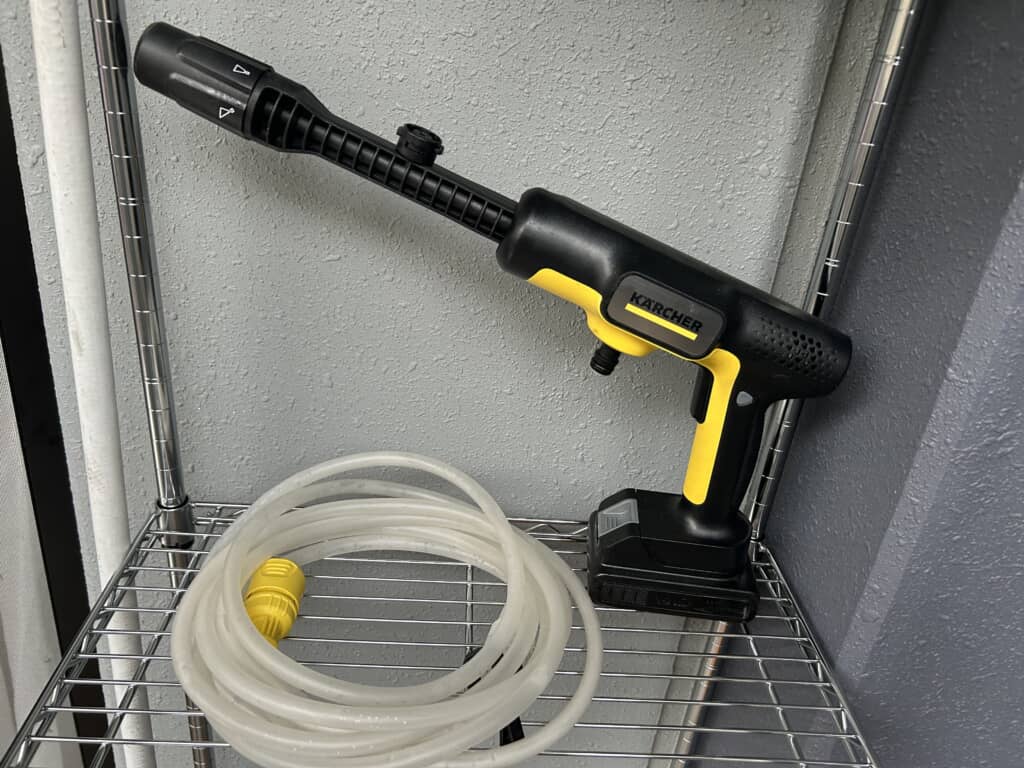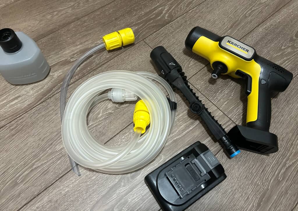内容物はロック機能付きの本体、5通りの水流に切り替えられる「5 in 1」ノズル、洗浄剤タンク、自吸用ホース、USB Type-C対応バッテリー。想像以上に軽く、取り回ししやすい印象です。さっそくベランダへ出て本体にセットしていきます。