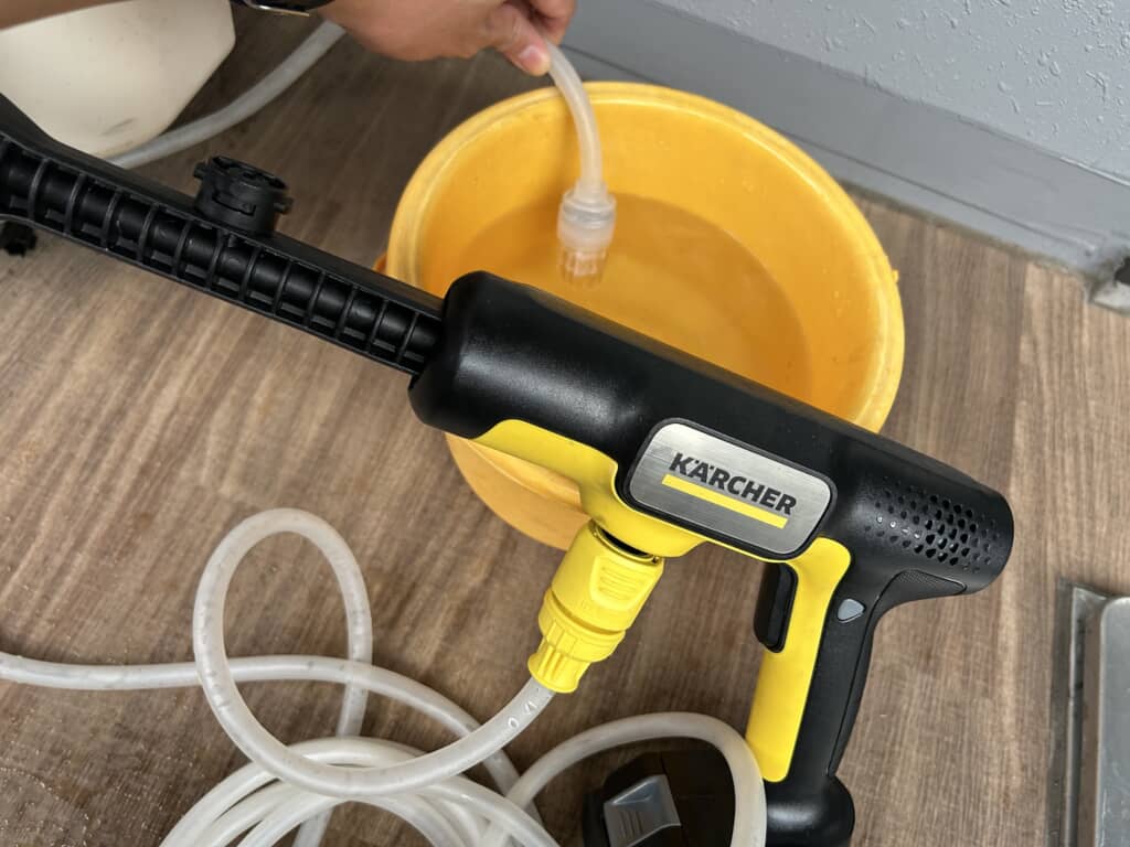 水を張ったバケツにホースを入れて、トリガー脇にあるグレーのロックを解除。排水の流れや周囲への水はねがないよう確認し、トリガーを引きます。本体が作動し、少し甲高い独特な機械音を響きたてながら、長いホースを水が駆け上がっていきます。そして……?