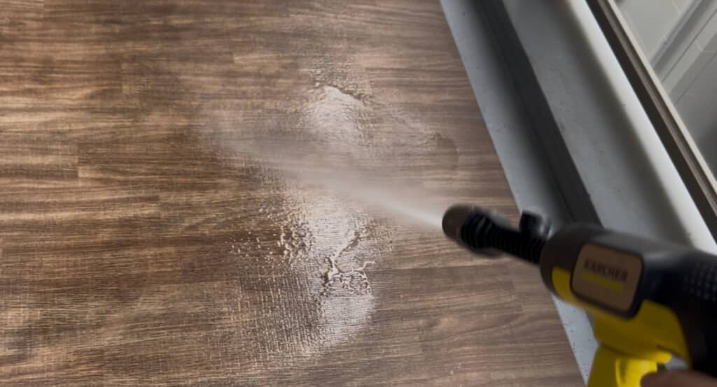 わずかな噴霧の直後、ノズルから勢いよく水が発射! ブシャシャシャ! と力強い音を立てながら黒ずみがどんどん落ちていくのがわかります。なにこれ、すごいじゃん。撮影しながらコントロールするのが少し難しいほどパワフルで、コードレスとは思えない心強さを実感します。